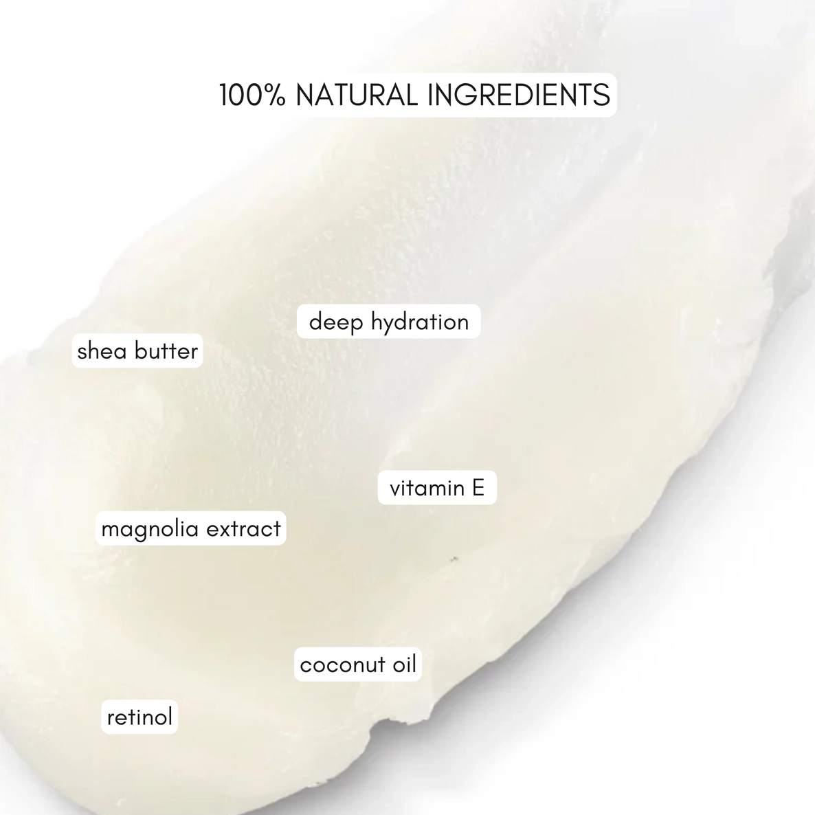 Butyrospermum Parkii Butter (sheavõi), Cera Alba (mesilasvaha), Cocos Nucifera Oil (kookosõli), Tocopherol (E-vitamiin), Retinol, Magnolia Officinalis Bark Extract (magnoolia kooreekstrakt)