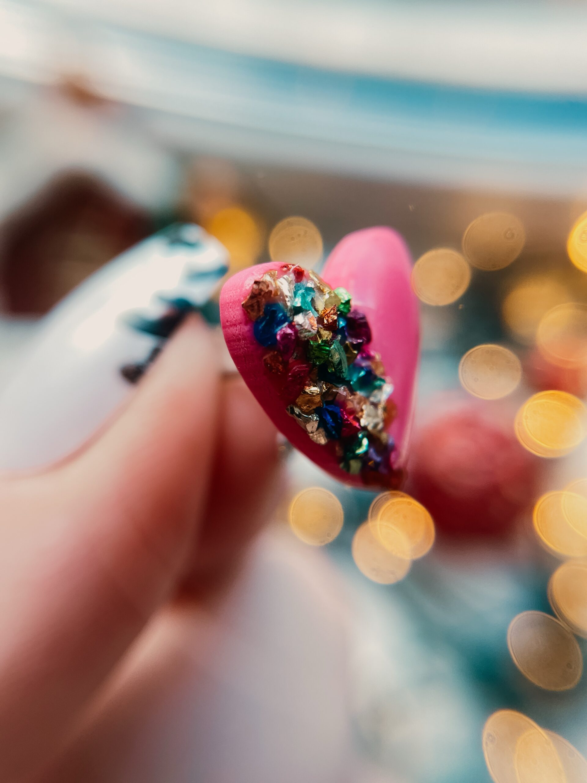 PS! Tegemist on käsitööehtega. Kui disaini on loodud mitu sarnast (põhivärv ja tehnika on sama) siis iga täpp, glitter, muster ei ole identselt samas kohas nagu tootefotol. Lisaks võib mõningane värvierinevus tuleneda etinevatest kuvaritest, ekraanisätetest.