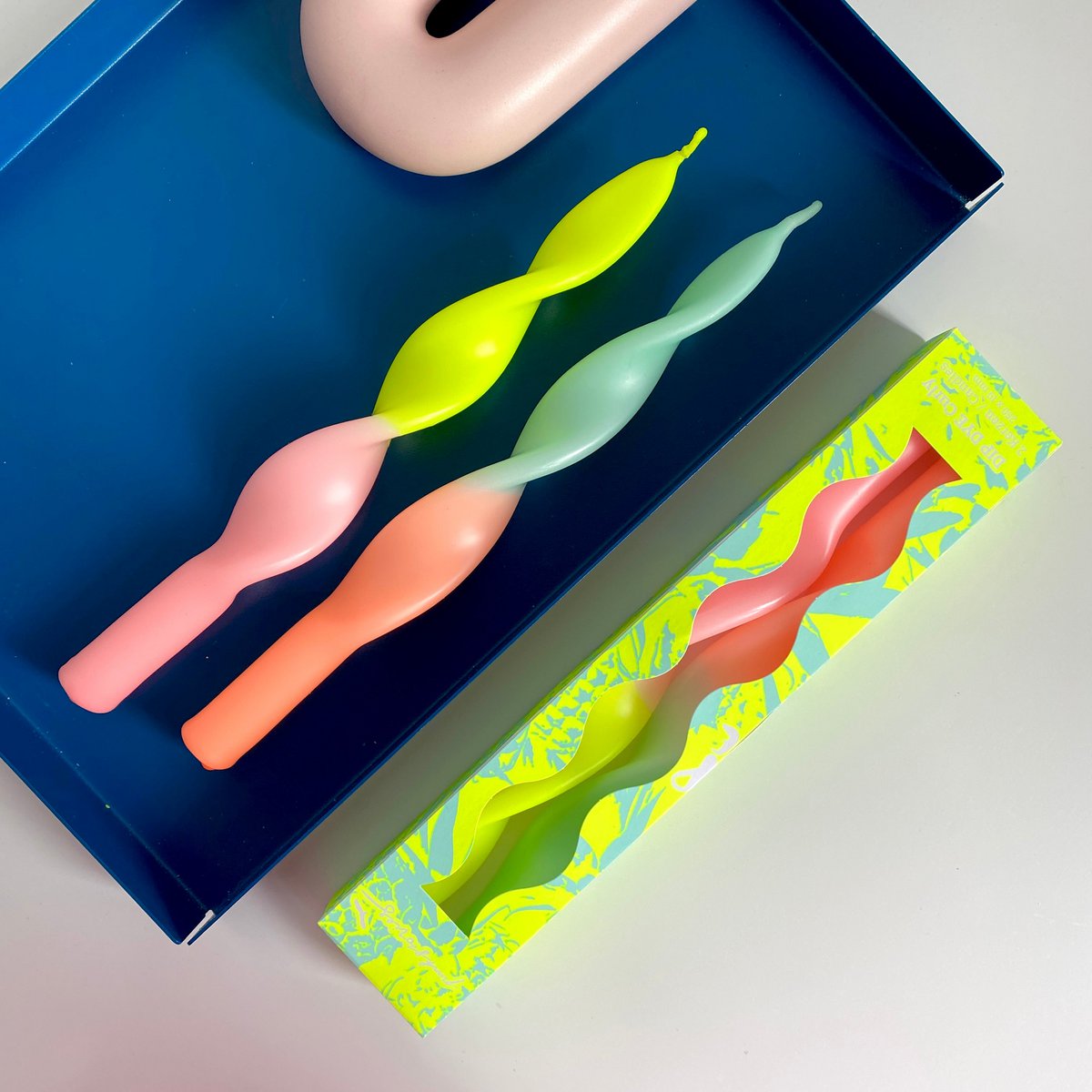 Komplekt kahest hoolikalt käsitsi värvitud ja käsitsi pööratud pulga-küünlast neoon värvistiilis.