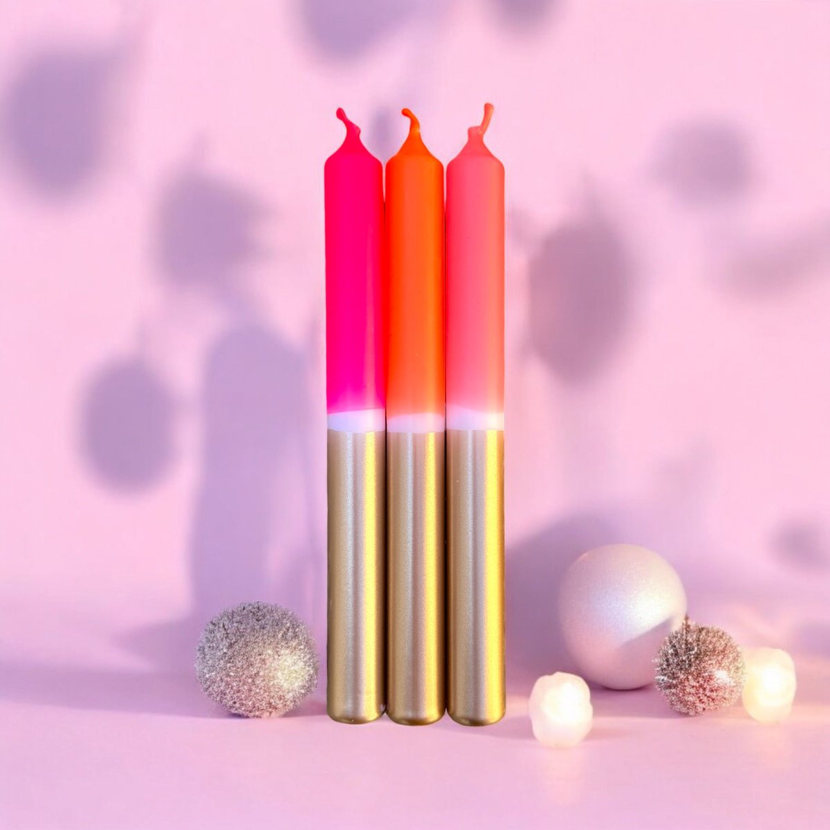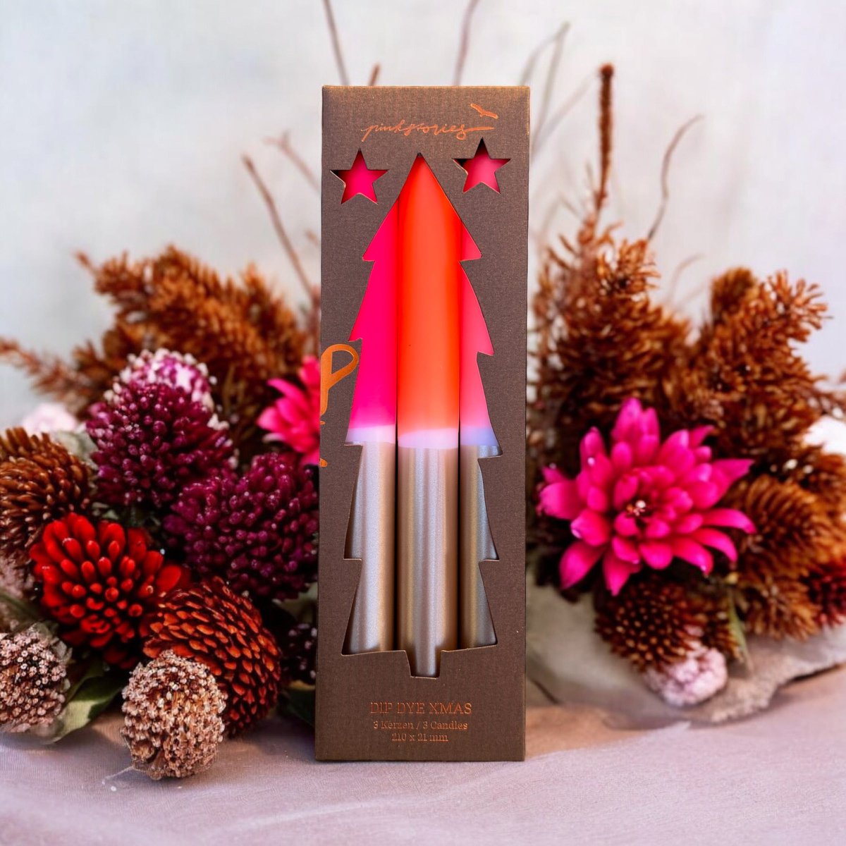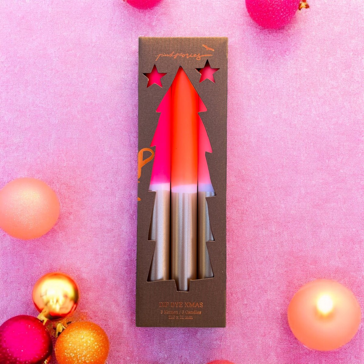 Tervita pühadehooaega meie kauni kolmest käsitsi kastetud küünlast koosneva komplektiga, mis toob sinu pidustustesse soojust ja rõõmu. Iga küünal algab erksavärvilise tipuga, mis sulandub sujuvalt luksuslikku metalliktooni põhjaosas, luues tõeliselt pilkupüüdva efekti, mis rikastab iga pühadekaunistust.
