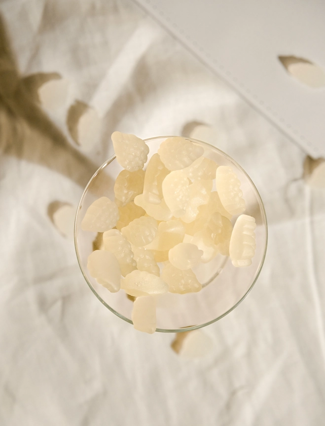 Glükoosisiirup, suhkur, modifitseeritud tärklis (mais, nisu, kartul), happed: sidrunhape, piimhape, mahlase ja küllusliku valge veini aroom, taimne õli (kookos), karnaubavaha